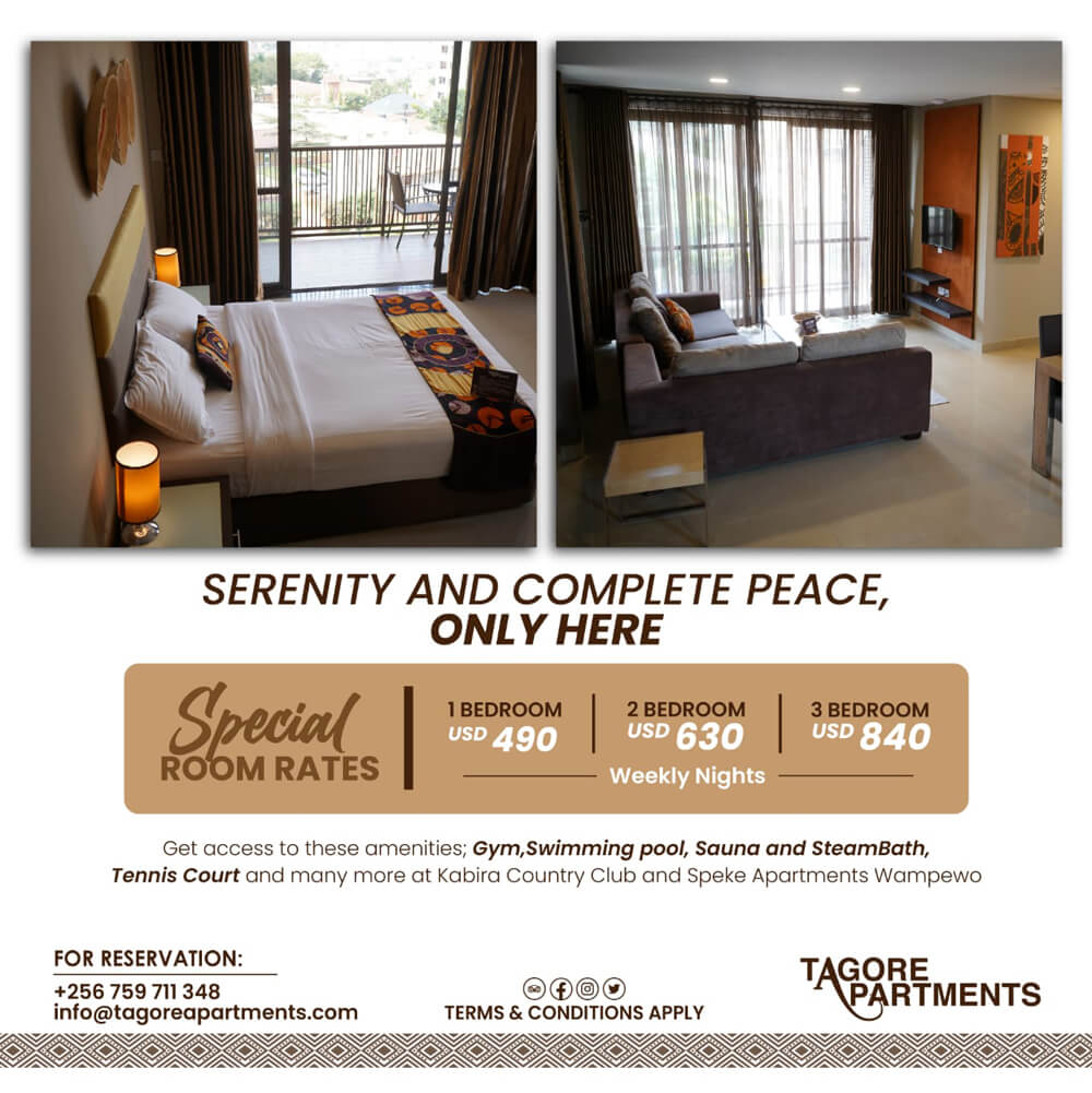 Tagore Apartments is an exclusive retreat primely located minutes away from the city to give our guests access to the best Kampala has to offer. Available for long- and short-term stays, Tagore’s fourteen apartments makes for an impressive presence from street level and has impressive views of Kampala’s cityscape. Tagore Apartments is equipped with spacious living quarters, a kitchen, bedrooms with two bathrooms and a balcony.